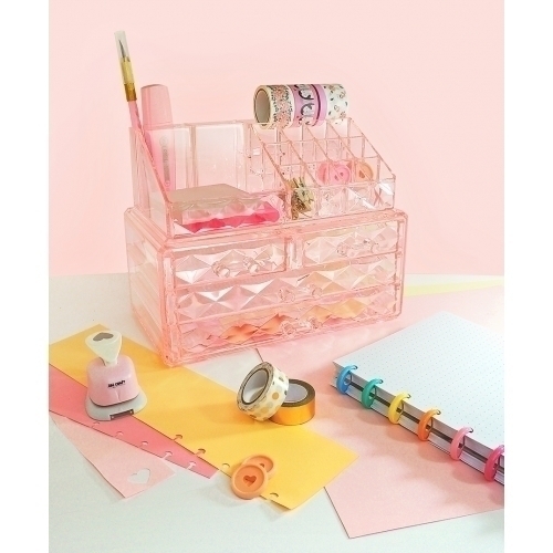 Organizador de escritorio con cajonera doble y bandeja compartimentada desmontable. Tiene 2 cajones angostos y 2 cajones largos. La base superior es demosntable, tiene espacio para taco de notas, resaltadores y más accesorios.